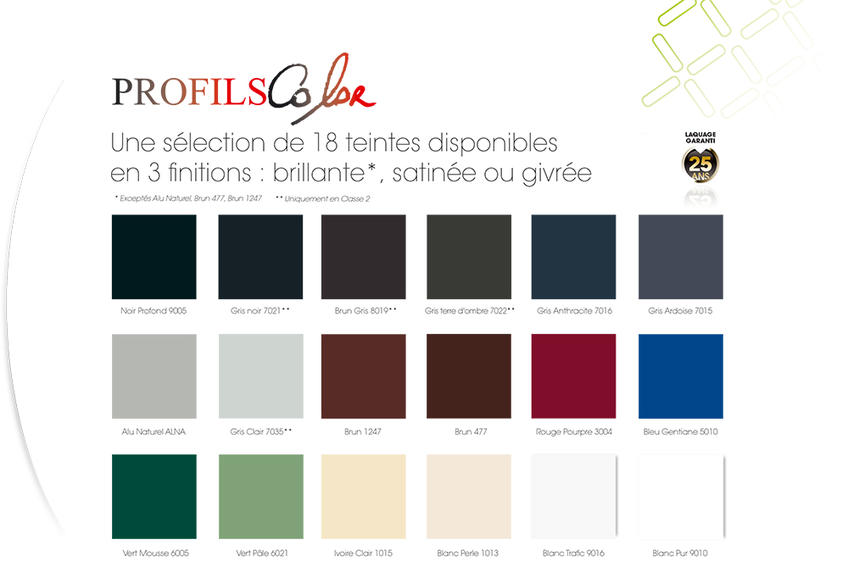 Précurseur dans le design, Profils Systèmes s’est très vite démarquée de ses concurrents par la richesse de son offre de couleurs et textures exclusives. Profils Color® est une sélection de 18 teintes de la palette RAL.